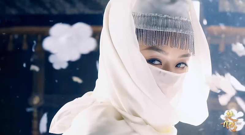 We see her showing her stunning martial arts. A masked man tells Chu Qiao that she killed her mother. Chu Qiao fights with some soldiers on the plain in the evening. She wears the veil and she hits someone in the morning. Her veil is off.