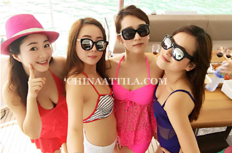 Big star and rich woman Nian Li shows bikini selfie with her girlfriends on a luxury yacht in China. She wears a rose red bikini and sit on a doll to show his sexy body.